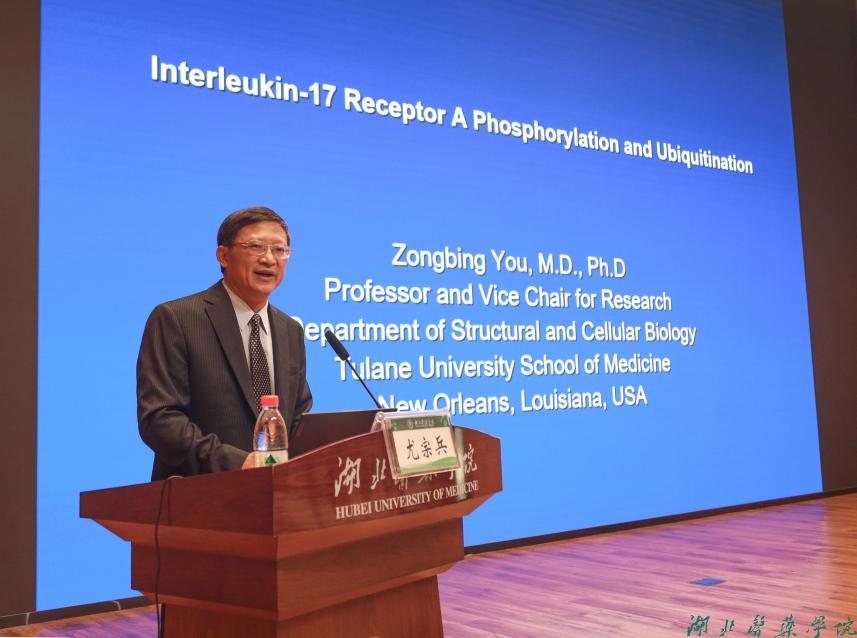 座谈会后,尤宗兵教授为我校师生做了题为“白介素-17受体A的磷酸化和泛素化”的学术报告。他详细介绍了白介素-17与前列腺癌的关系、肥胖与前列腺癌的关系以及白介素-17受体A的磷酸化和泛素化,与师生进行了互动答疑。